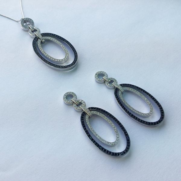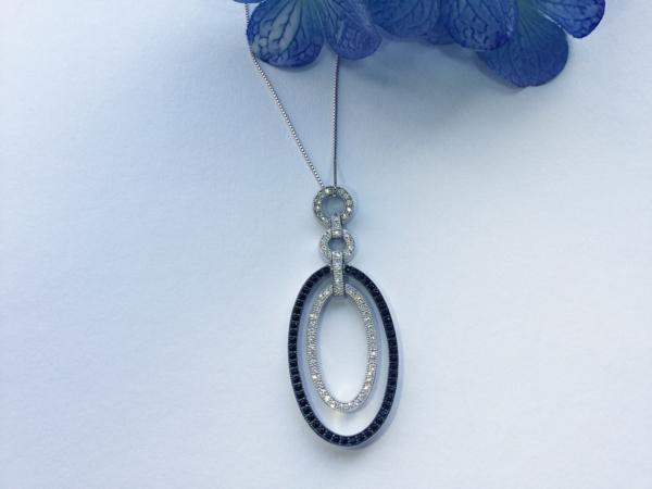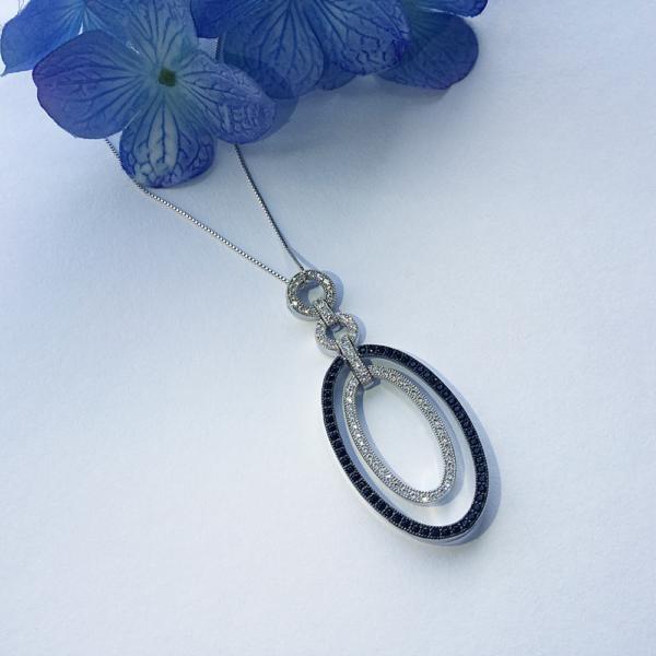 925er Sterlingsilber rhodiniert, 18 ct. Weißgold vergoldet mit schwarzen und weißen Zirkonia, Durchmesser 54 mm x 21 mm. Halskette: 925er Sterlingsilber rhodiniert, 18 ct. Weißgold vergoldet, Federringverschluss, Länge 42 cm.
