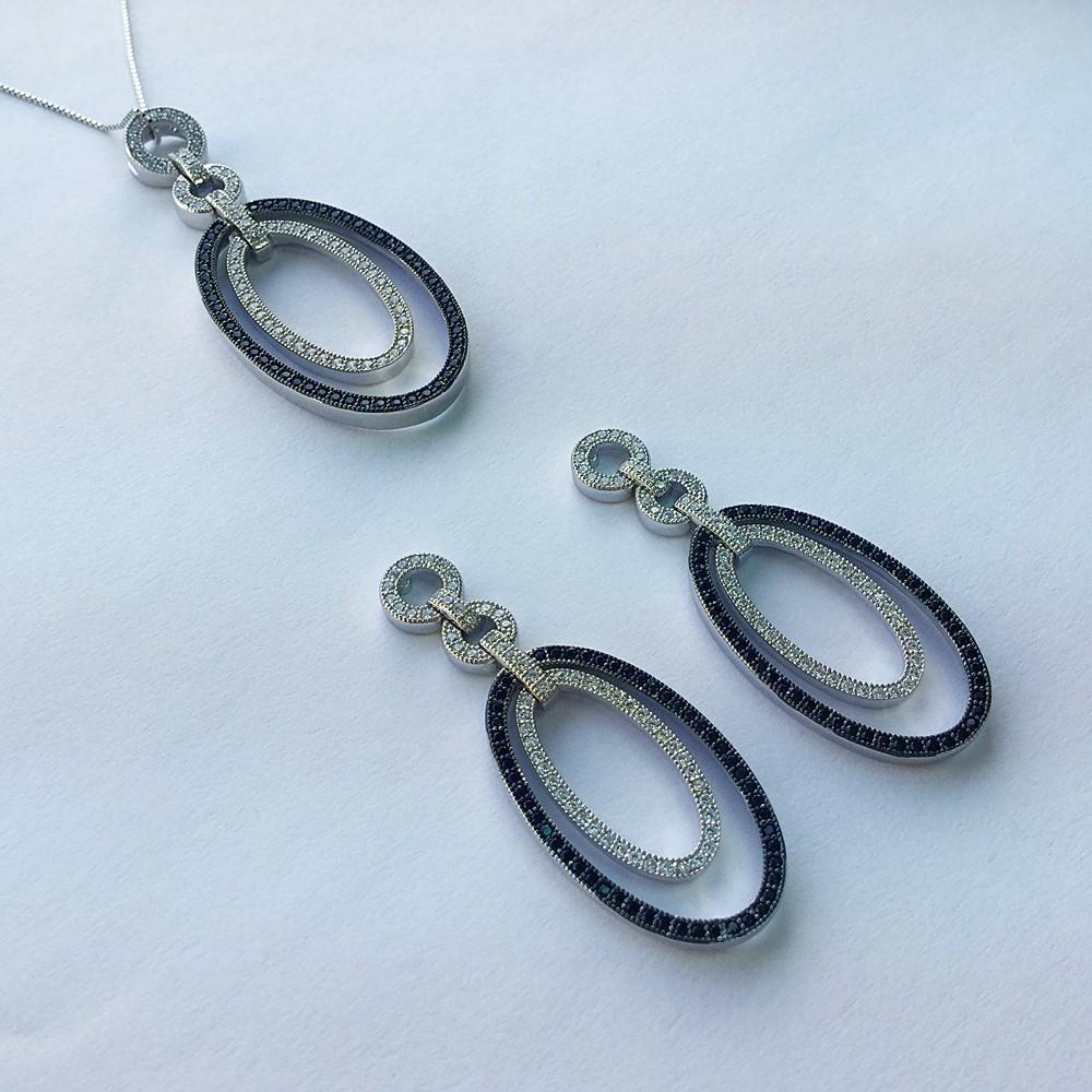 Der Anhänger aus der Serie STATEMENT by Michaela Blessing-Fischer verkörpert mit seinem luftigen und leichten Design ein anmutiges glamouröses Antlitz. 120 von Hand gefasste funkelende schwarze und weiße Zirkonia strahlen hier um die Wette und begeistern damit die Trägerin ebenso wie den Betrachter. Ein Schmuckstück welches absolut die Erwartungen einer modernen Frau erfüllt. Insbesondere in Kombination mit den passenden Ohrringen ist dieses Set sowohl tagsüber wie auch am Abend ein luxuriöses STATEMENT.