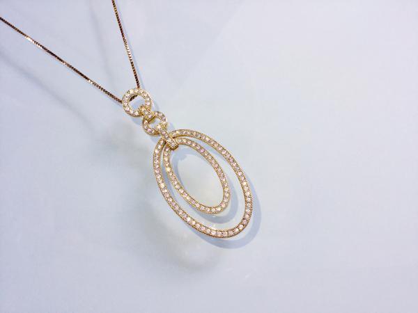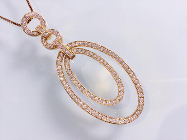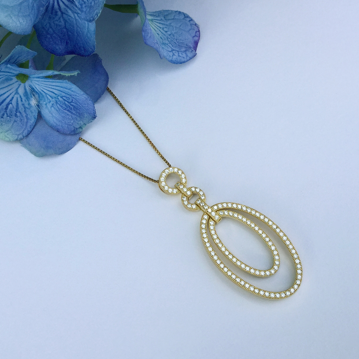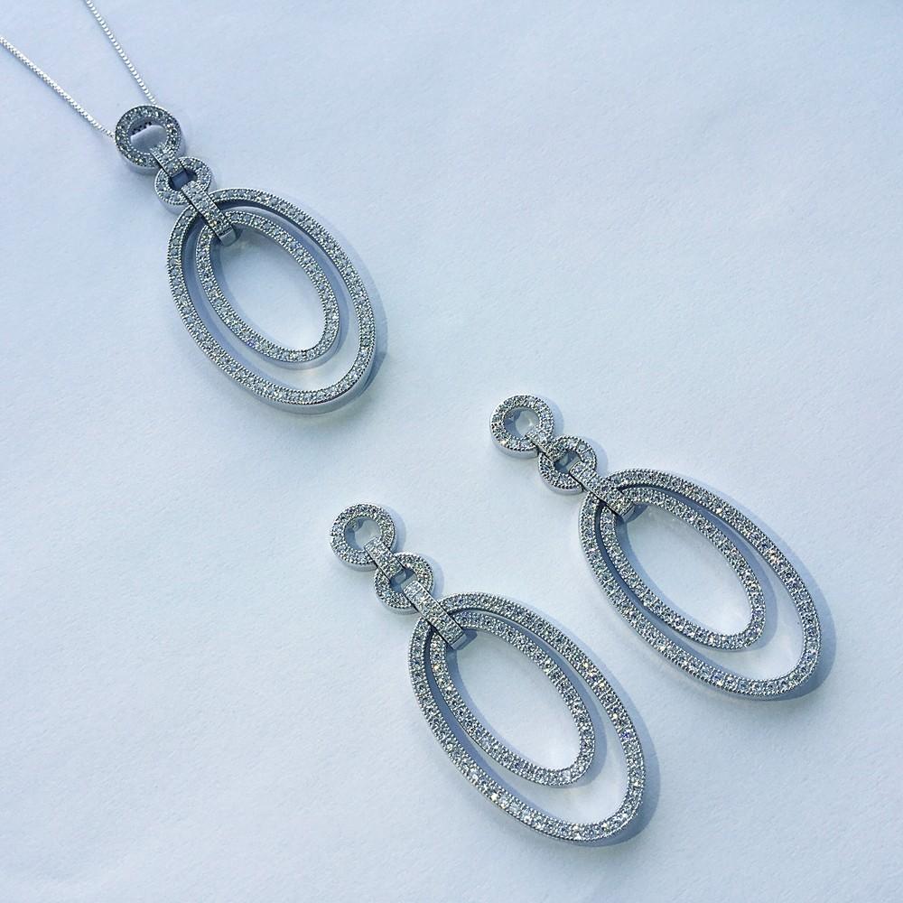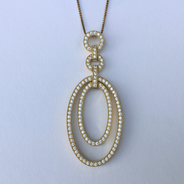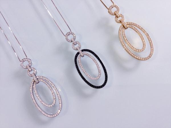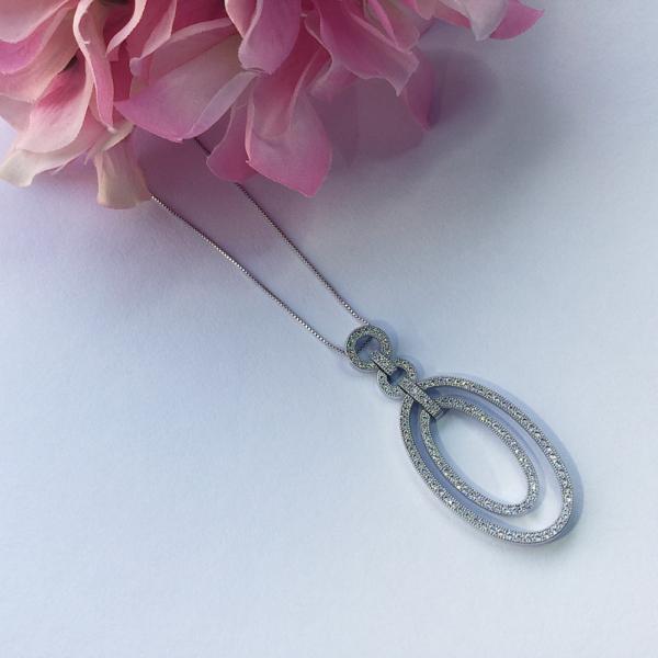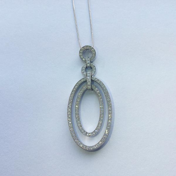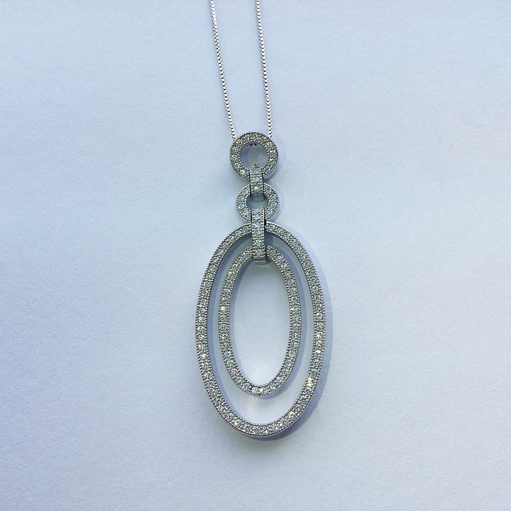 925er Sterlingsilber rhodiniert, 18 ct. Weißgold vergoldet mit weißen Zirkonia, Durchmesser 54 mm x 21 mm. Halskette: 925er Sterlingsilber rhodiniert, 18 ct. Weißgold vergoldet, Federringverschluss, Länge 42 cm.