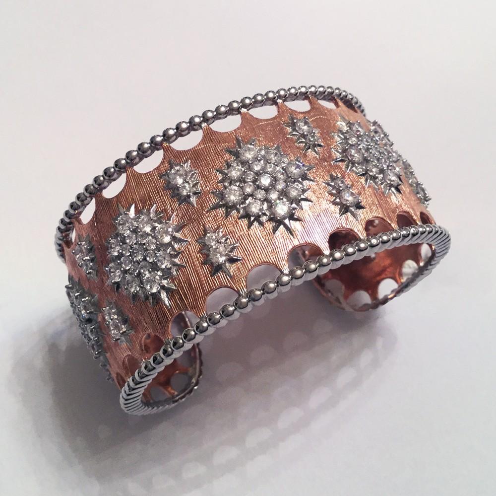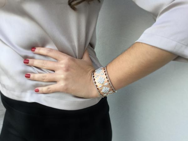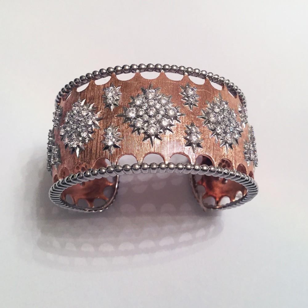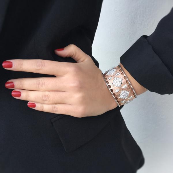 Funkelnd wie der nächtliche Sternenhimmel glitzern die Zirkonia bei dieser in 18 ct. Rosegold vergoldeten Armspange um die Wette. Eine fantastische Kreation, die den magischen Zauber der Sterne widerspiegelt und den Betrachter sofort in seinen Bann zieht. Eine Symbiose aus Faszination und Eleganz