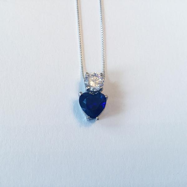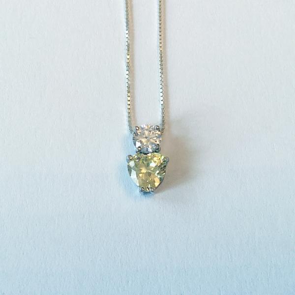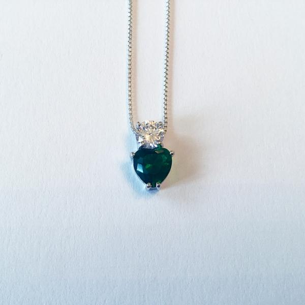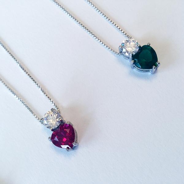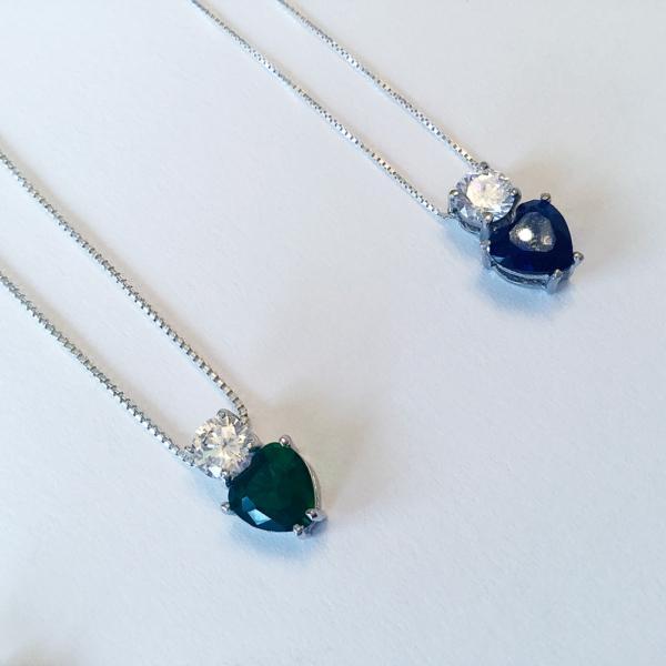 925er Sterlingsilber rhodinierter Anhänger, 18 ct. Weißgold vergoldet mit weißem Zirkonia kombiniert mit einem weißen, gelben, roten, grünen oder blauen Stein, ca. 1,5 cm. Halskette: 925er Sterling Silber rhodiniert, 18 ct. Weißgold vergoldet, Federringverschluss, Länge 45 cm