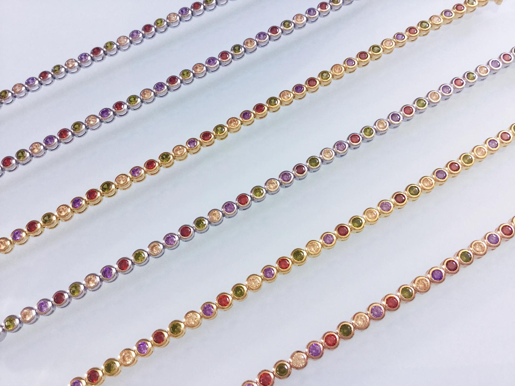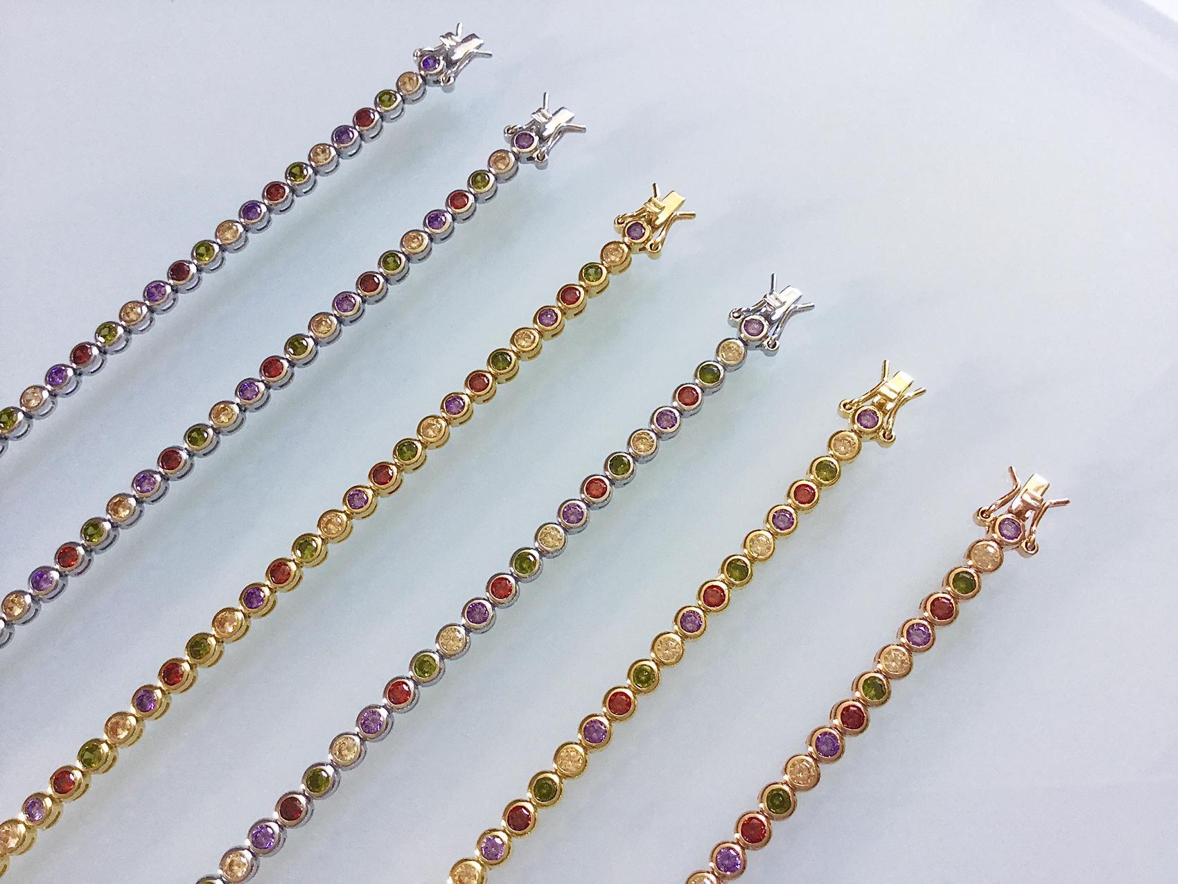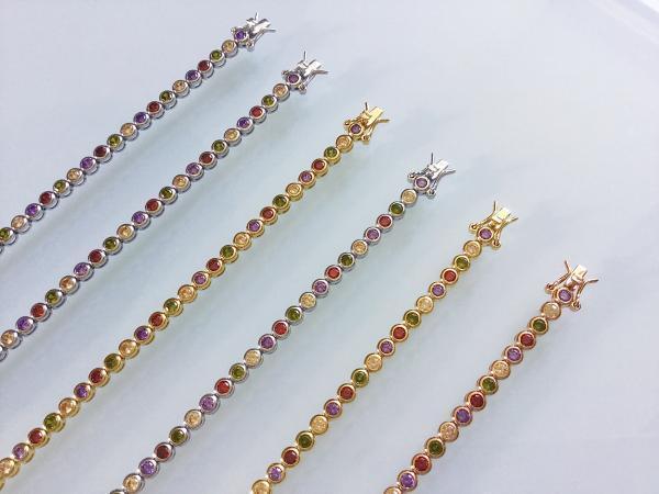 925er Sterlingsilber rhodiniert, 18 ct Weißgold, 18ct Gelbgold oder 18ct Roségold vergoldet, bunte Zirkonia in schöner voller Rundfassung, Kastenverschluss mit Sicherheitsachter