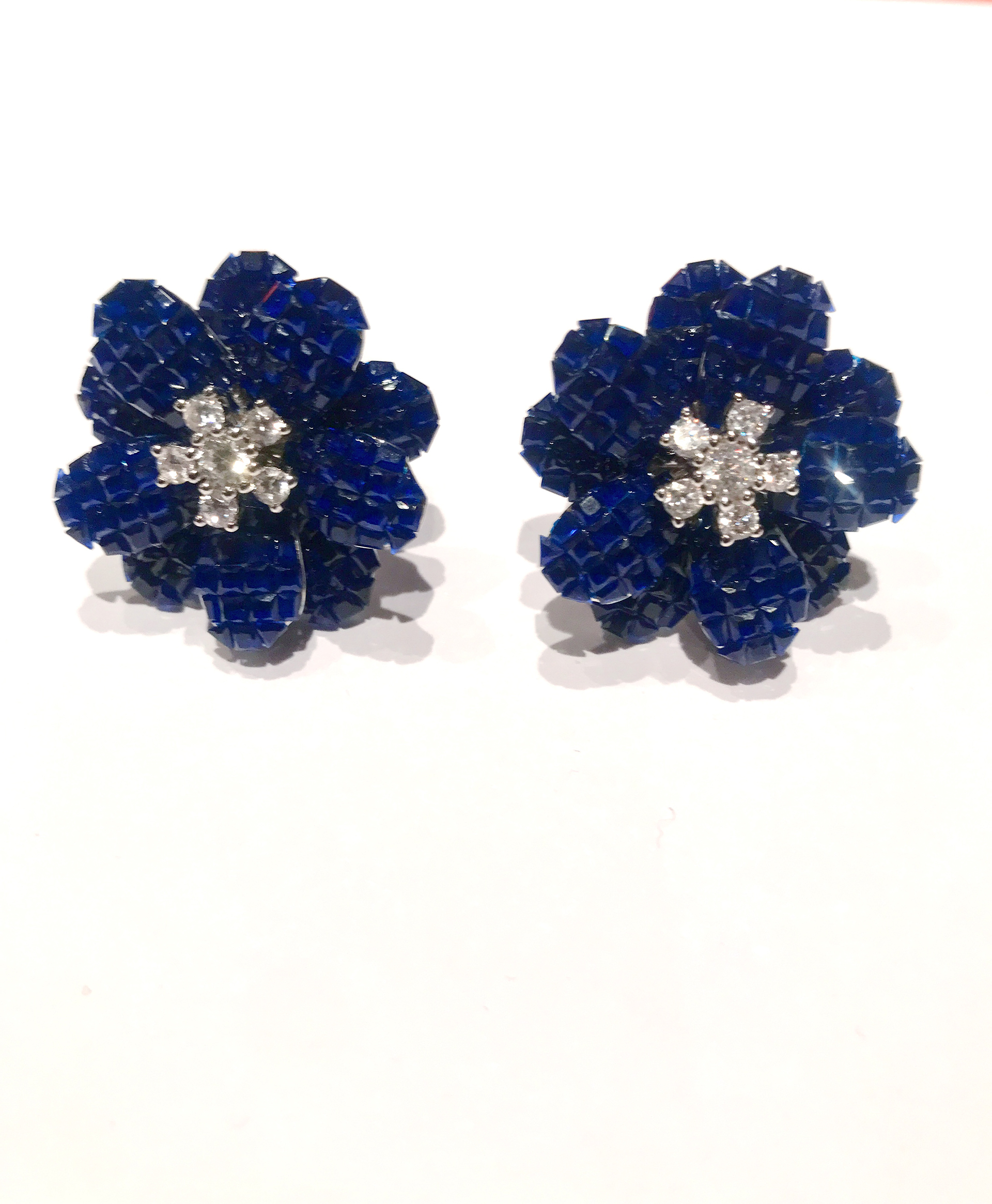 Each stone of this Flower Earrings in Royal Blue is „mystery-set“ with no visible prongs or metal. An extremely painstaking and highly skilled setting style seen only in the highest of fine jewels.