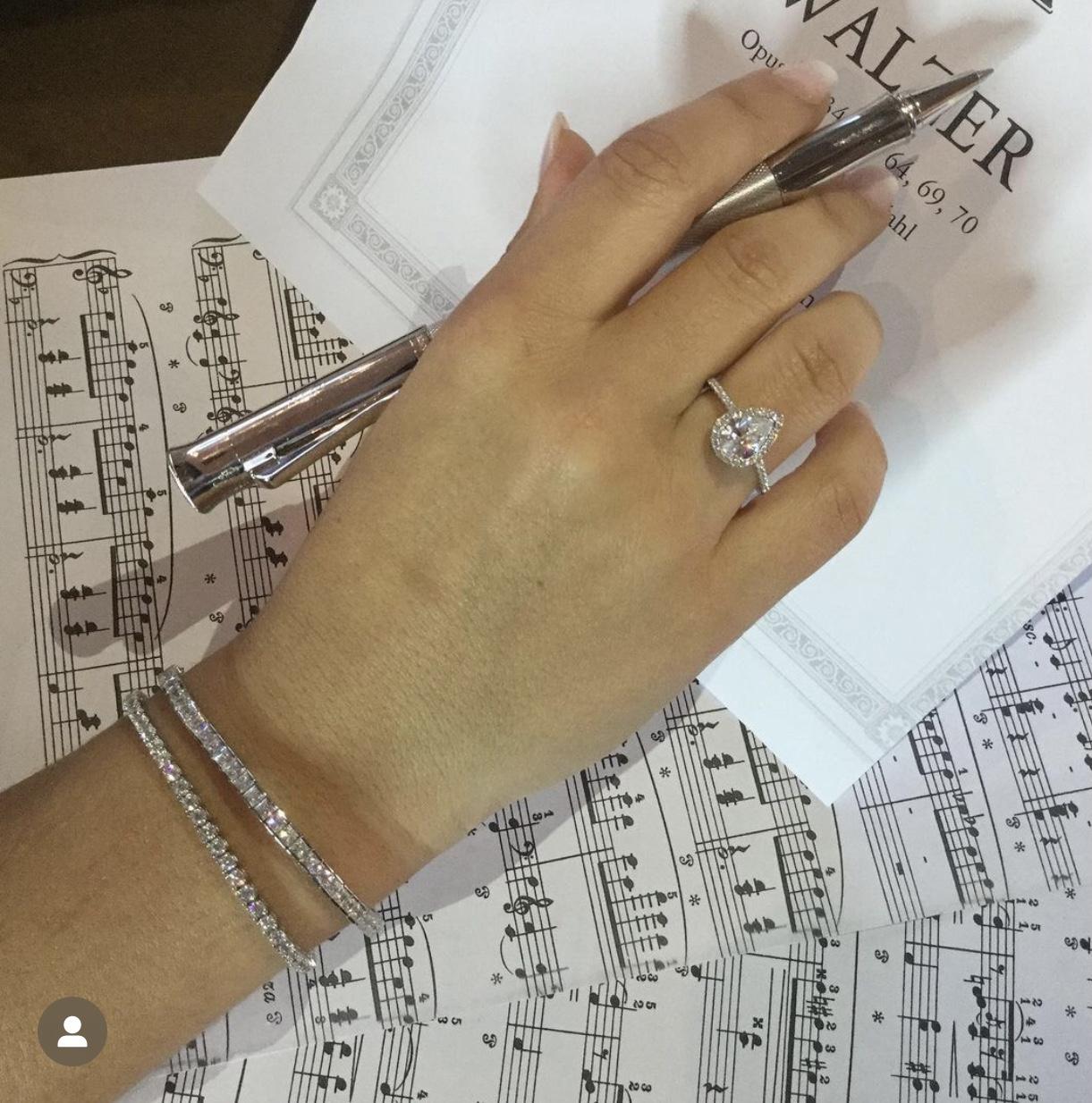 The sparkling pear shaped center stone ring and and the beautiful Tennis Bracelets fill your Love Story with brillance and romance.